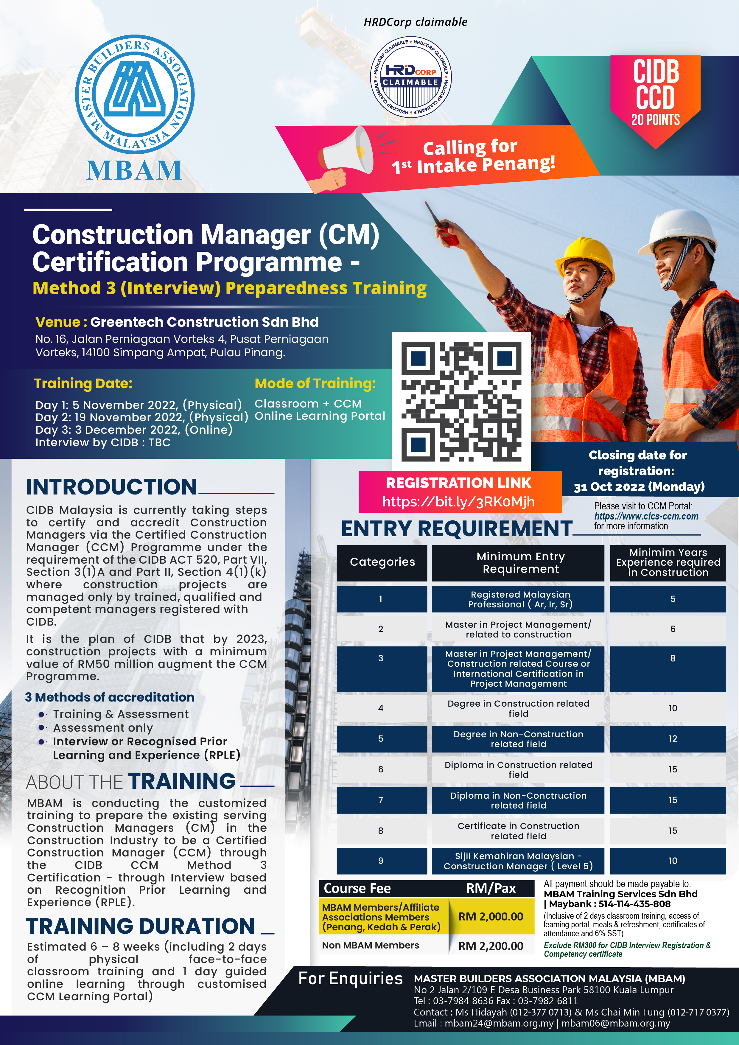 To prepare the existing serving Construction Managers in the Construction Industry to be a Certified Construction Manager (CCM), MBAM is calling for 1st Intake Penang on the above training through the CIDB CCM Method 3 Certification through interview based on Recognition Prior Learning and Experience (RPLE).