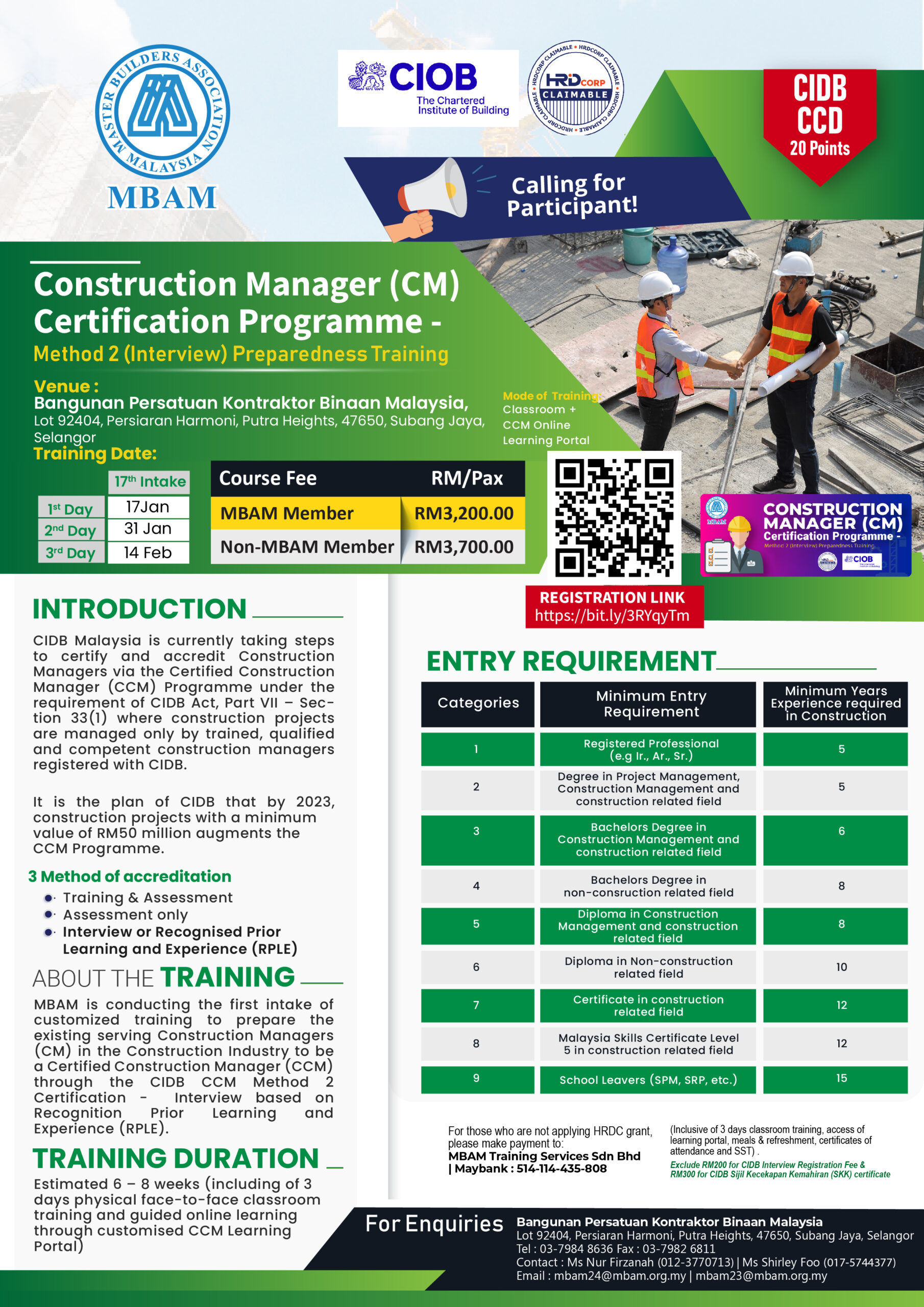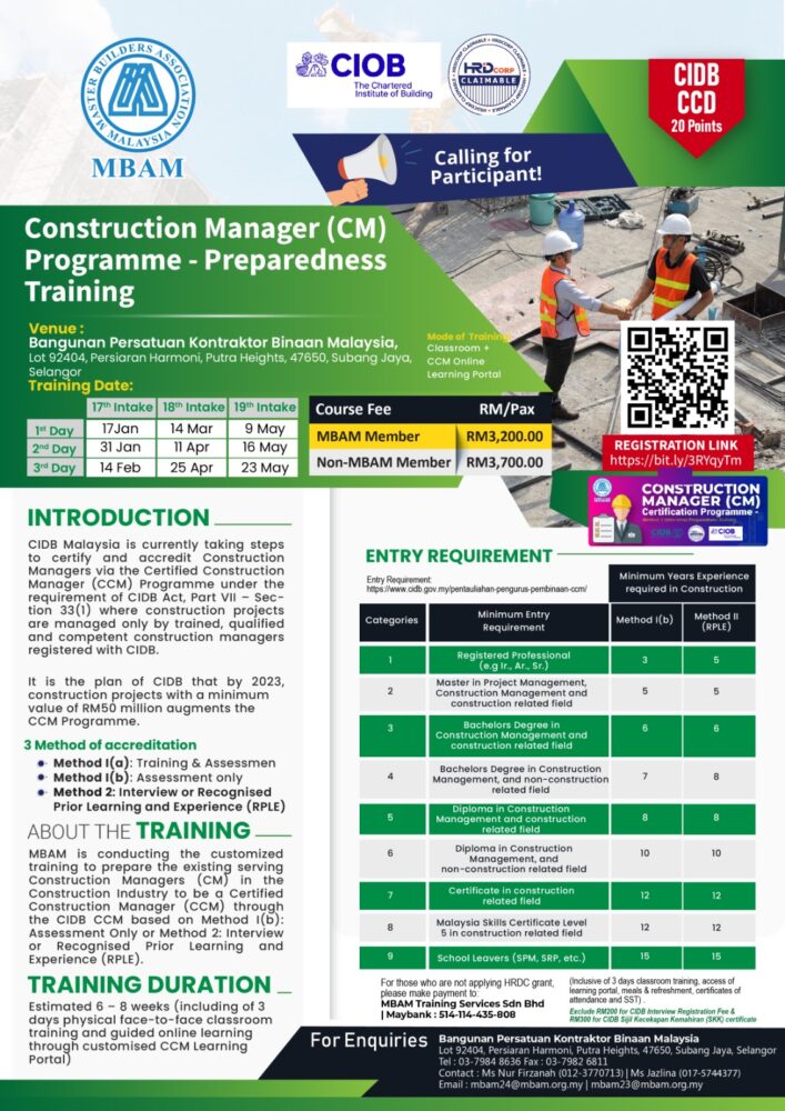 In line with our objectives to prepare the existing serving Construction Managers in the Construction Industry to be a Certified Construction Manager (CCM), MBAM is calling for KUALA LUMPUR Intake of the above training through the CIDB CCM Method 3 Certification through interview based on Recognition Prior Learning and Experience (RPLE).