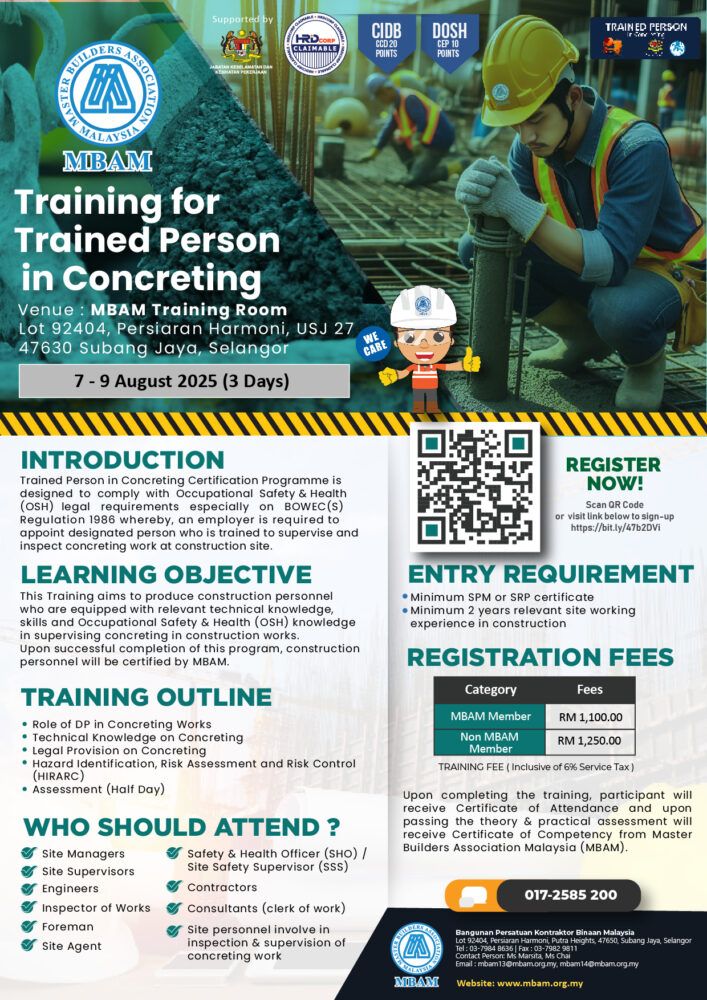 Trained Person in Concreting Certification Programme is designed to comply with Occupational Safety & Health (OSH) legal requirements especially on BOWEC(S) Regulation 1986 whereby, an employer is required to appoint designated person to supervise and inspect concreting work at construction site.