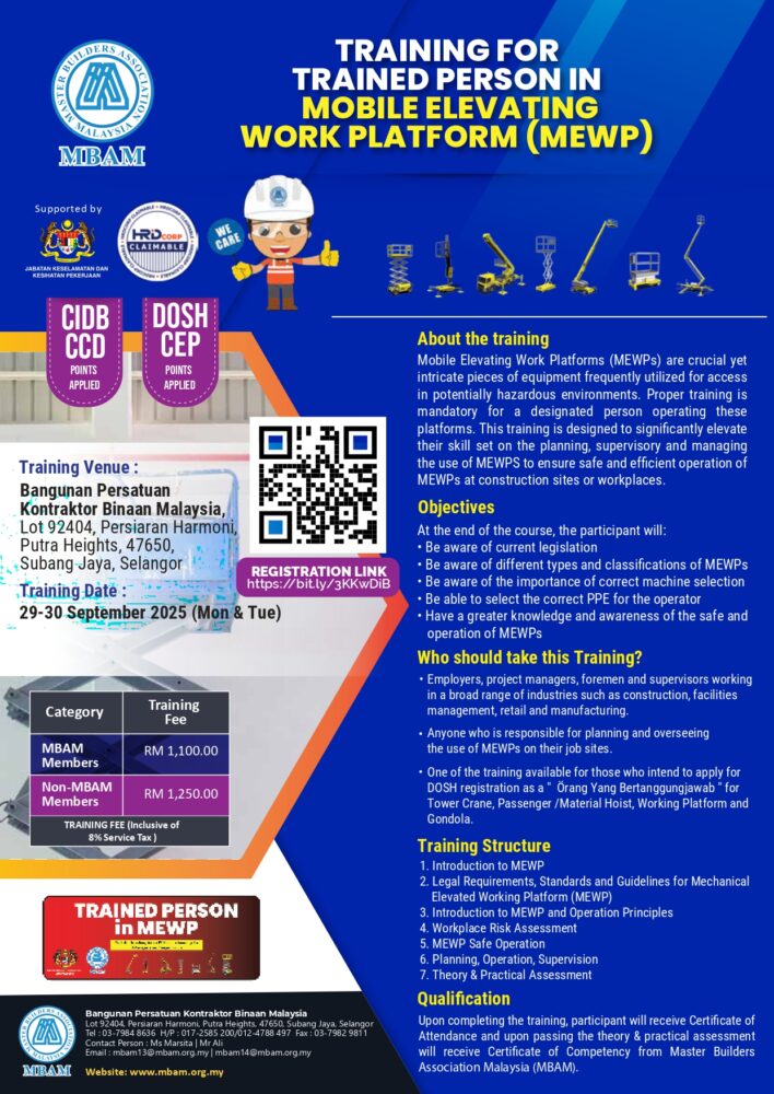 Mobile Elevating Working Platform (MEWP) are crucial yet intricate pieces of equipment frequently utilized for access in potentially hazardous environments. Proper training is mandatory for a designated person operating these platforms. This training is designed to significantly elevate their skill set on the planning, supervisory and managing the use of MEWPS to ensure safe and efficient operation of MEWPs at construction sites or workplaces.