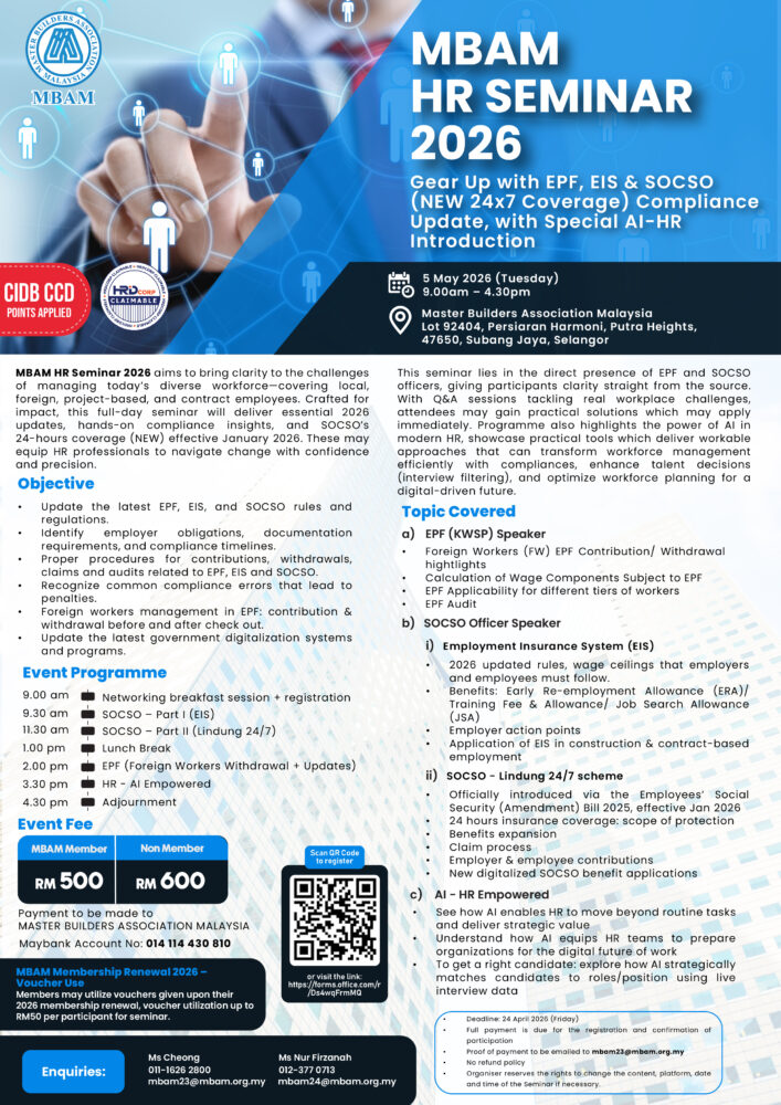 MBAM HR 2026 SEMINAR: EPF-Latest Benefits/update & SOCSO – EIS & New Implementation of 24/7 Coverage | MBAM HR 2026 SEMINAR: EPF-Latest Benefits/update & SOCSO – EIS & New Implementation of 24/7 Coverage – Master Builders Association Malaysia