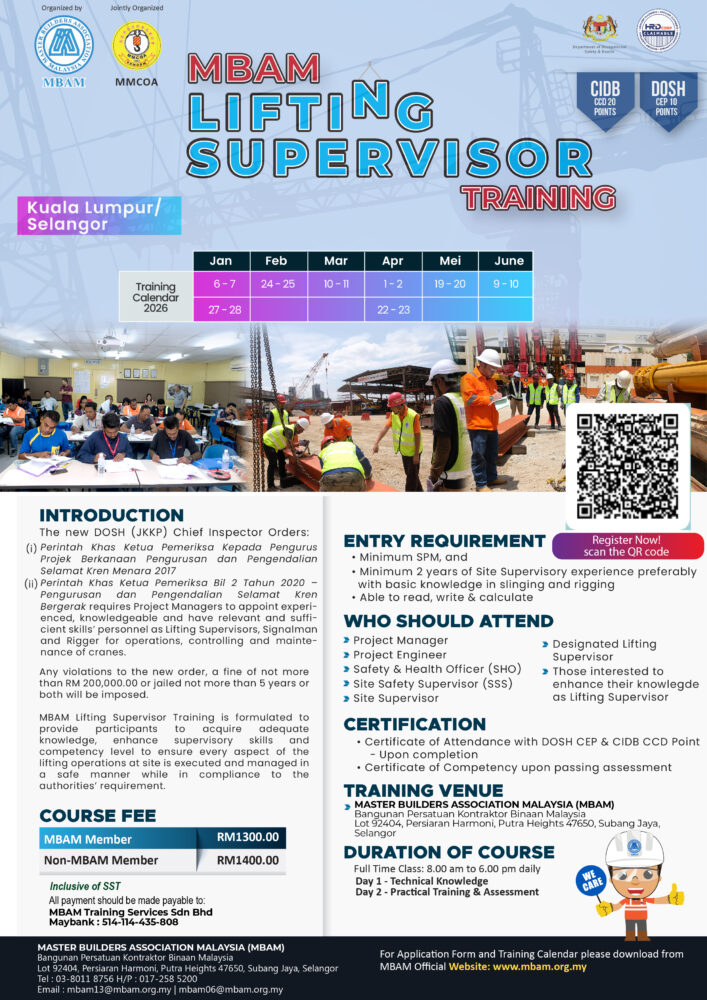 The new DOSH (JKKP) Chief Inspector Orders: (i)Perintah Khas Ketua Pemeriksa Kepada Pengurus Projek Berkanaan Pengurusan dan Pengendalian Selamat Kren Menara 2017 (ii) Perintah Khas Ketua Pemeriksa Bil 2 Tahun 2020 – Pengurusan dan Pengendalian Selamat Kren Bergerak requires Project Managers to appoint experienced, knowledgeable and have relevant and sufficient skills’ personnel as Lifting Supervisors, Signalman and Rigger for operations, controlling and maintenance of cranes. Any violations to the new order, a fine of not more than RM 200,000.00 or jailed not more than 5 years or both will be imposed. MBAM Lifting Supervisor Training is formulated to provide participants to acquire adequate knowledge, enhance supervisory skills and competency level to ensure every aspect of the lifting operations at site is executed and managed in a safe manner while in compliance to the authorities’ requirement. Should you need any further information, please do not hesitate to contact: MBAM LIFTING SUPERVISOR TRAINING