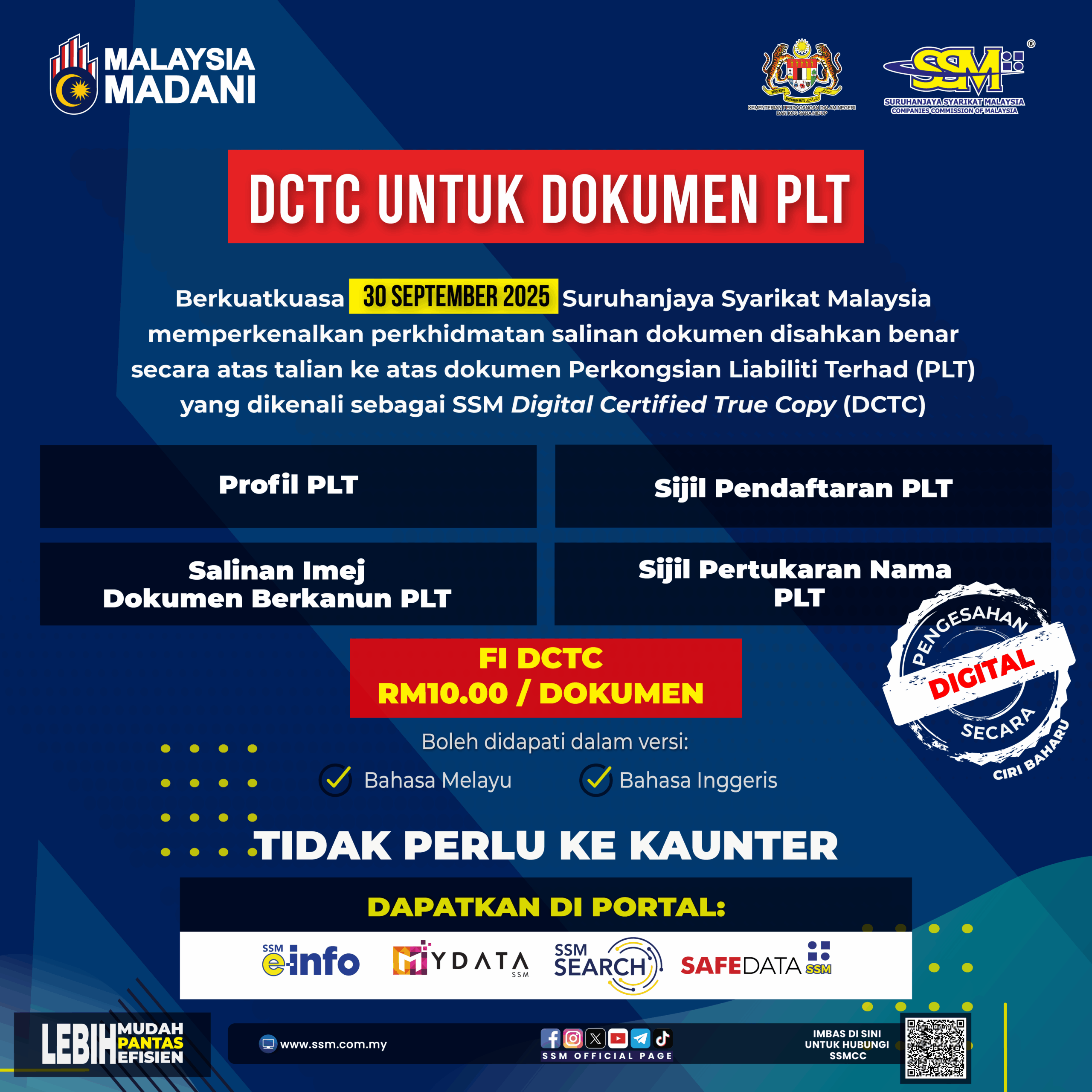 Effective 30 September 2025, SSM’s Digital Certified True Copy (DCTC) service is now available for LLP-related documents. This enhancement allows users to obtain digitally certified copies of LLP documents directly through SSM’s official corporate information supply platforms, as listed below: